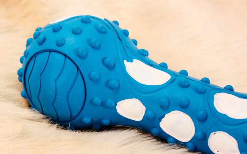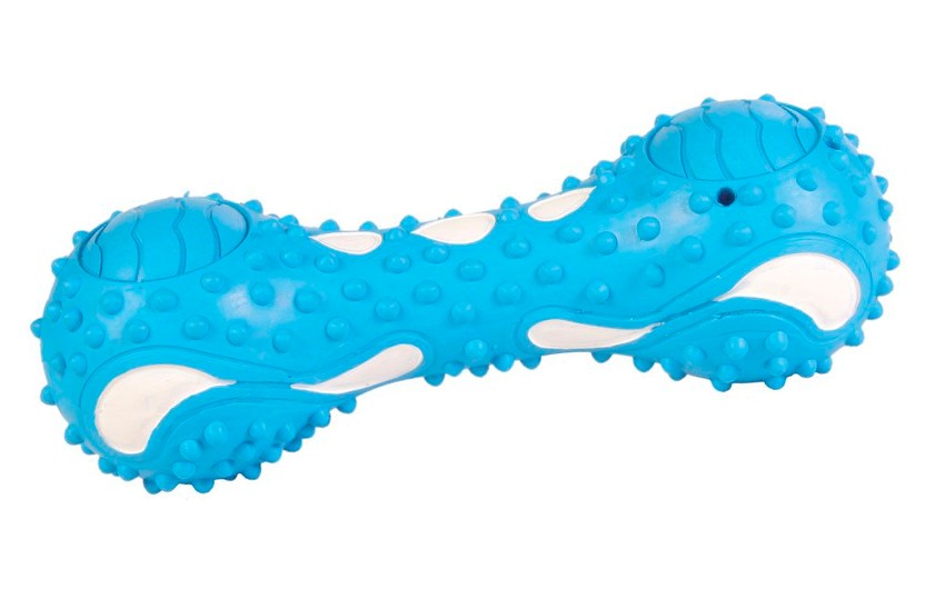 El agua se escapa de los pequeños poros, mientras que el perro lo muerde. Para una sensación más refrescante simplemente congela la pesa.