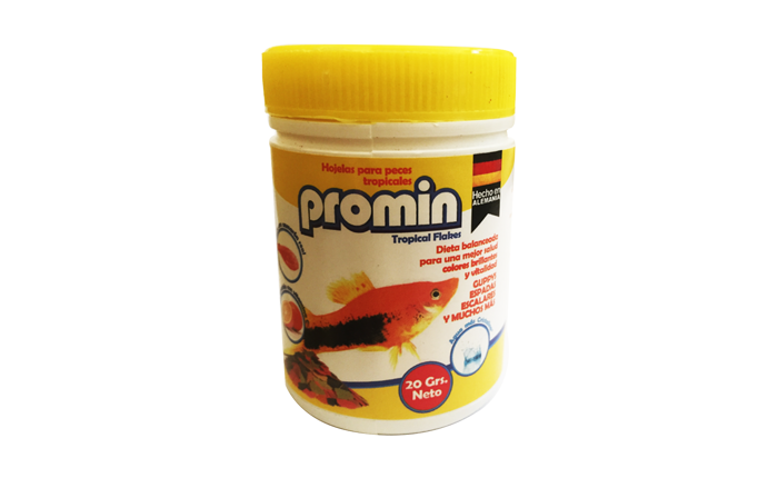 necesita de esto para conservar un buen color, salud y vitalidad, Promin entrega proteínas, grasa, fibra y vitaminas en forma de escamas, las que los peces disfrutan